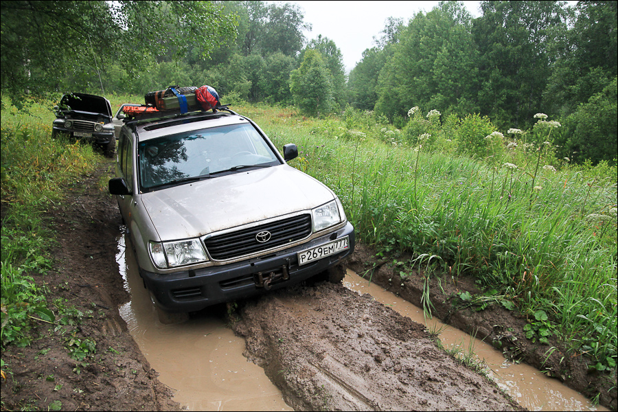Дальше хуже. Догоняю Андрюху, машина которого стоит поперек глянняного спуска. Он пытается выбраться по сколькой глине и спустится по краю, но ренга постоянно разворачивает и скидывает в глубокую колею-протоку. В итоге он с сумасшедшими кренам прошел по это яме.