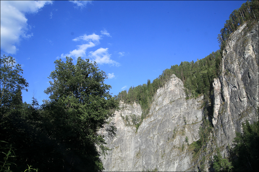 А далше началась сказка. Огромные отвесные скалы выступают над рекой. То слева, то справа и нам приходится постоянно перезжать с берега на берег.