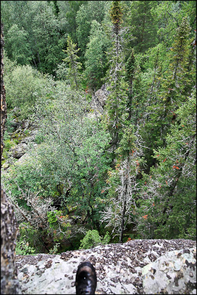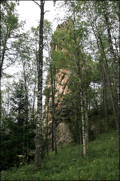 Идти пришлось по лесу прямо под огрмоными скалами.