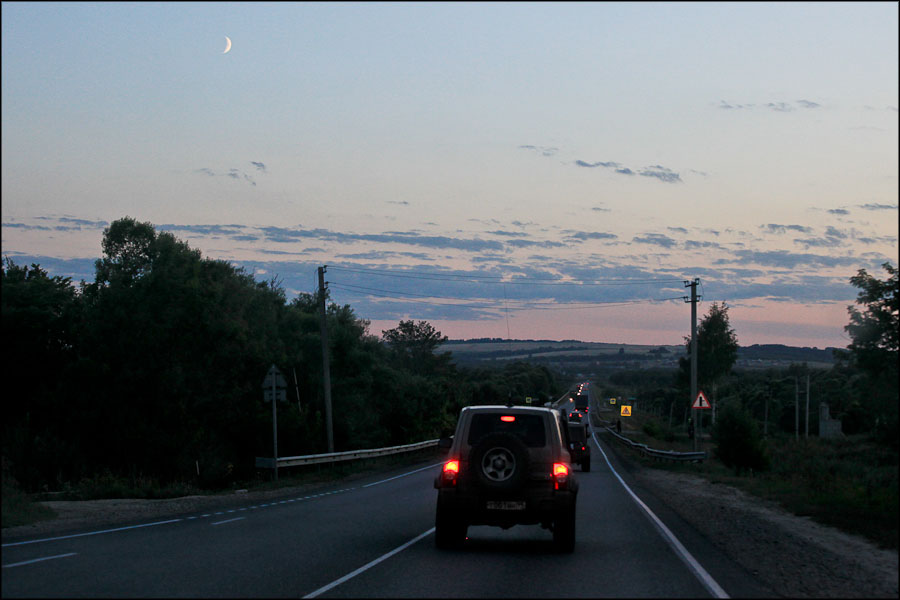 Дорога пустая, петляет и перепрыгивает с холма на холм.