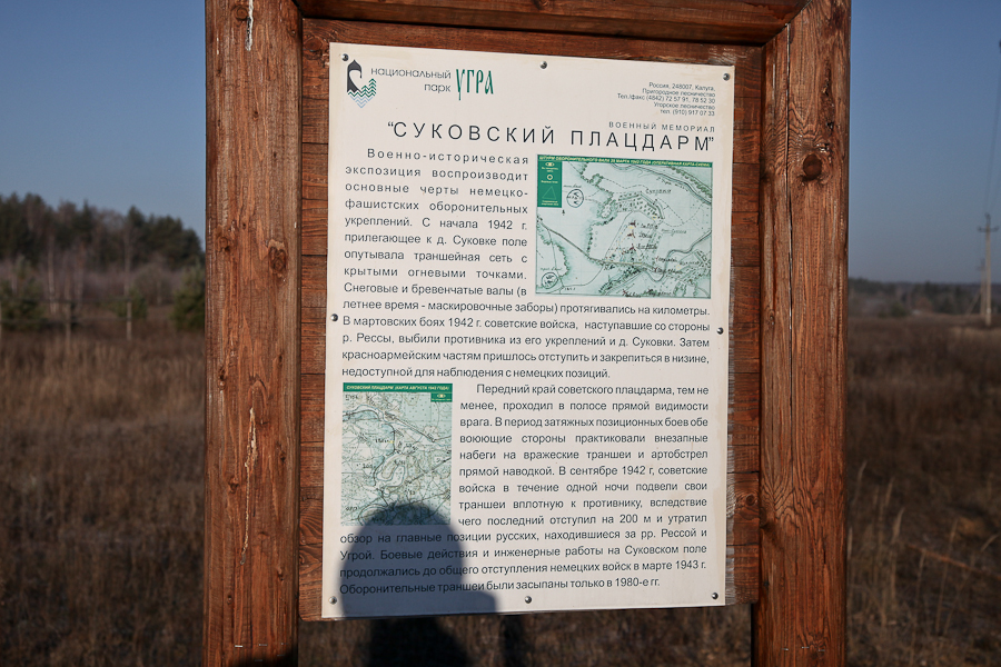 Ночевали мы ...в десятке метров от окопов. До сих пор хорошо сохранились и окопы и блиндажи, растянувшиеся вдоль Угры. В 1942 году на этом месте был Суковский плацдарм - почти год на маленьком клочке земли шли ожесточенные бои.