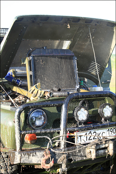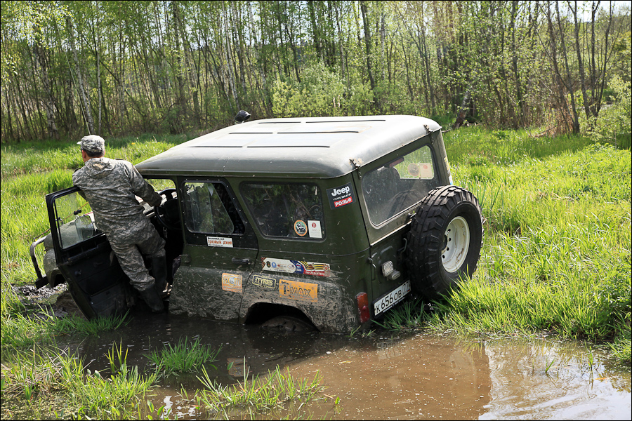 Немного просушившись после водных процедур, двигаемся дальше. Мелкие лужи с глубокими колями порою коварны - приходится разматать лебедку.
