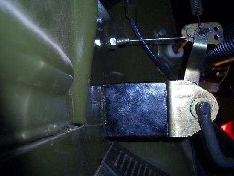 И в окончание надо установить саму педаль газа. Для этого и нужен профиль, иначе педаль будет слишком глубоко "упрятана" под торпедо. Место под педаль каждый ищет исходя из своих анатомических особенностей. После того как место будет найдено, надо убедиться, что при полностью нажатой педали обе дроссельные заслонки открыты. Сверлим отверстия и закрепляем педаль через проставку из профиля. Педаль надо также подпружинить. Переставляем штатную пружину на новую педаль и закрепляем тросик в секторе. Получится примерно это: