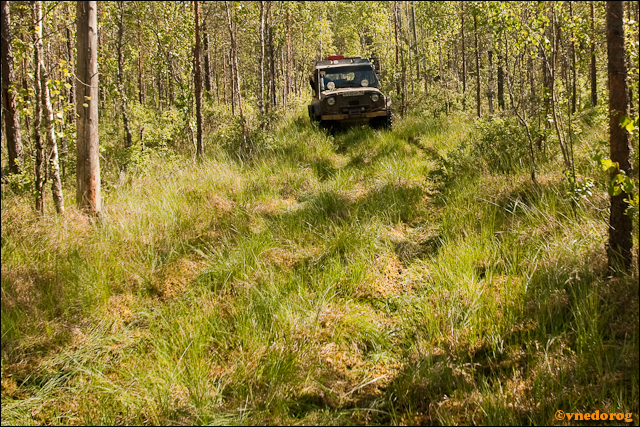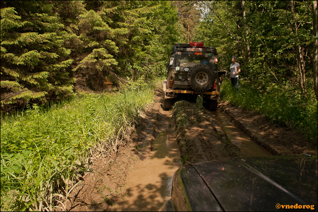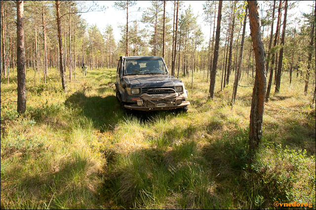Но больше всех поразил тяжелый хаммер на 37 колесах. Поначалу он шел внатяг, но дорога уже была подразбита предыдущими машинами. Начав подсаживаться, он поддал газу. И превратился из джипа в торфовыбрасывательную машину. Такого фонтана грязи я никогда не видел - все елки вокруг были в торфею. Но он пролетел - поразительно, но мощное двигло на болоте вынесло машину. Конечно, пришлось полебедиться, но я думал, что Хаммер вообще не сможет пройти болото.
