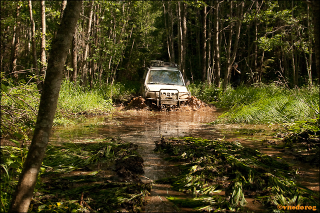Местами удается объезжать засады по лесу. Выбираемся на какую-то разъезженную лесовозку, тут еще хуже. Глина чуть подсохла, но машину не держит. Приходится ехать по лесу. Правда, забраться туда можно только на лебедке.