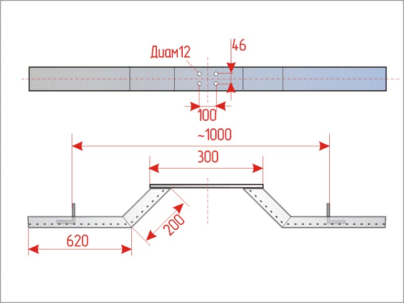 Конструкция моего бампера не нова - практически все делают так же. Бампер состоит из трех частей - двух половинок, крепящихся на вылеты рамы по бокам, и центральной пластины, крепящейся под фаркоп. Размеры на чертеже. Пожалуй, "вылеты" бампера можно было бы сделать и побольше, но тогда я бы стал цеплять за мелкие деревья, да и оторвать бампер при подъеме джеком на большом плече гораздо легче. От швеллера болгаркой отпилил 2 куска длиной 820 мм (для боковых частей) и кусок длиной 300 мм (центральная часть). В двух боковых сделал пропилы ребер и надпил по основной части и загнул. Сначала хотел согнуть под углом 45 градусов, но в конечном счете получилось чуть меньше. У швеллера центральной части отпилил ребра, сторона с отпиленными ребрами идет к раме. Просверлил 4 отверстия диаметром 12.5 мм под фаркоп. Затем на ровной поверхности разложил всю конструкцию и прихватил сваркой. Затем обязательно стоит примерить на машине - только после этого окончательно проварил.
