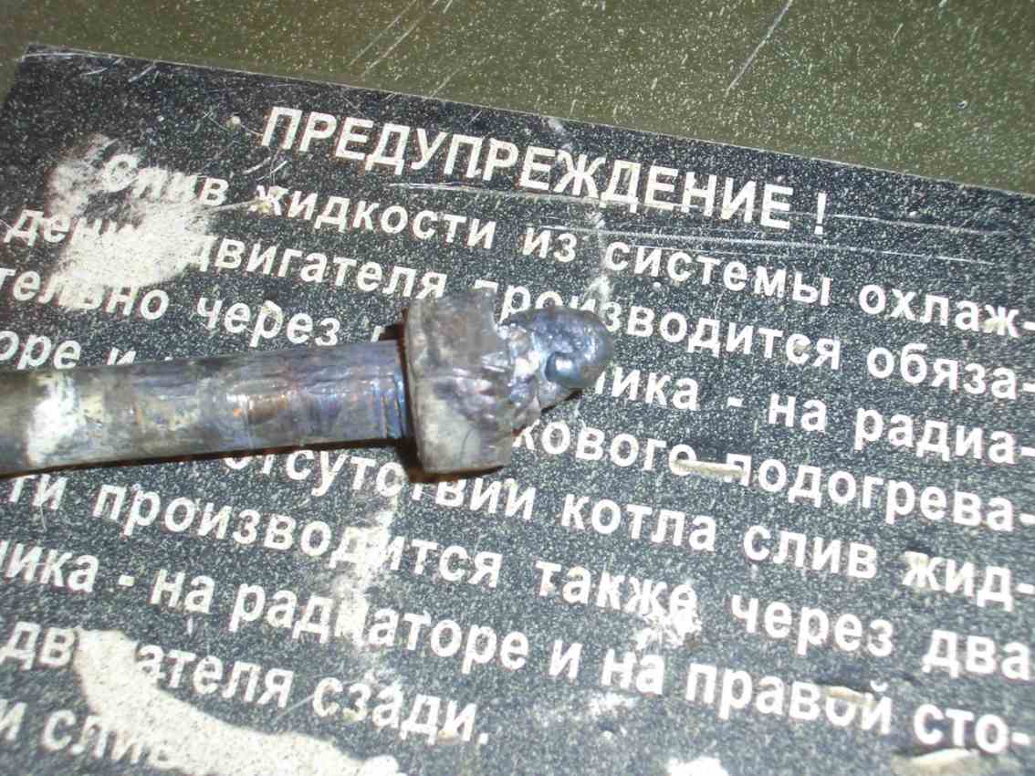 1. Сливаем ОЖ из двигателя и радиатора (если планируется только поменять термостат, то всю ОЖ сливать не надо, достаточно слить 4-5 литра). Для этого есть 2 краника – один справа на блоке, другой – слева на радиаторе. Если машина укомплектована штатным предпусковым подогревателем, то вместо краника на блоке сливаем ОЖ через краник в котле подогревателя.
