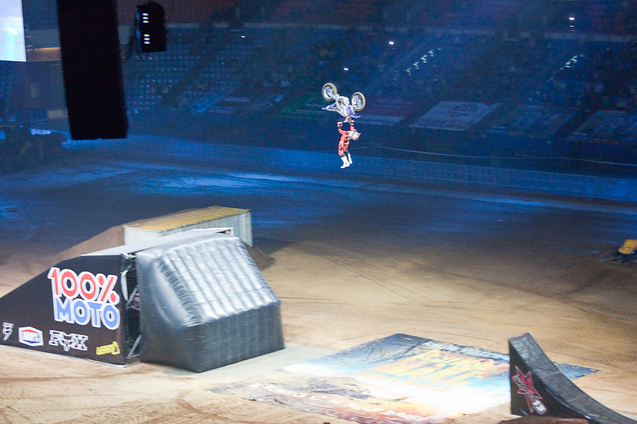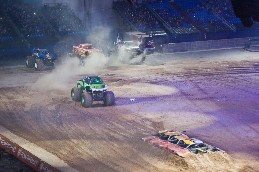 В прошлом году довелось побывать на шоу Джереми Кларксона и ожидал что то подобного. Но то ли кризис наступил, то ли  шоу готовили российские сценаристы, вышло довольно смазано в плане организации. Но сами монстры и трюки  мотоциклистов очень впечатлили, чем и хочу поделится. Сразу прошу прощения за качество фотографий  - сидели мы далеко от сцены, было темно, а машины ездили очень быстро. Найти компромисс межу ISO, "дыркой" и выдержкой не всегда получалось.