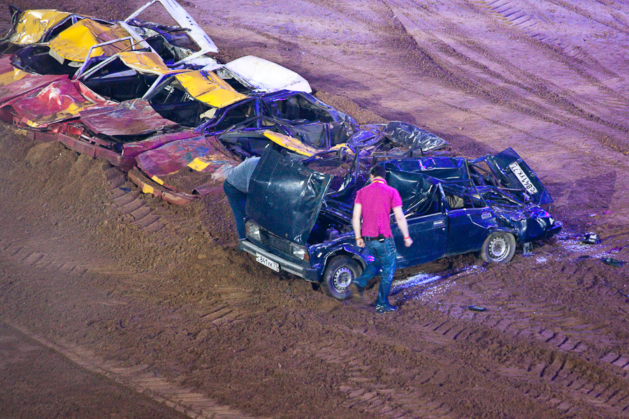 Наконец начались заезды. Суть проста - надо сделать пару кругов, проехавшись по крышкам легковушек-смертнец. Дикий рев и помчались