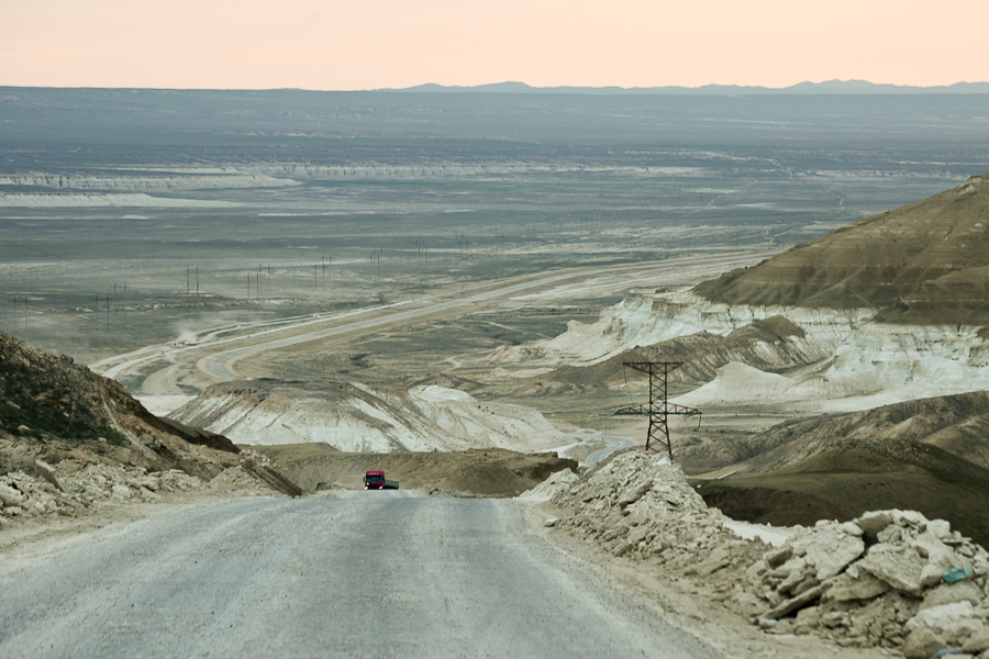 Выбрались на шоссе и помчали по асфальту дальше в сторону Актау. Кстати , шоссе построили только в 2014 году, асфальт идеально гладкий. Но есть кусочек около 40 км, где работы еще ведутся.