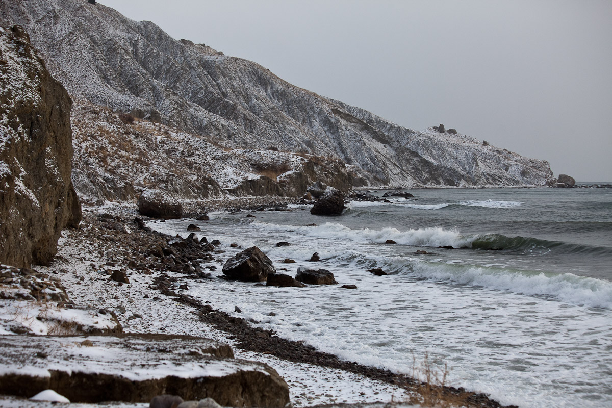 Побережье Лисьей бухты довольно дикое и является любимым место отдыха нудистов и неформалов. Глядя на снег и лед, нудистами зимой тут и не пахнет.