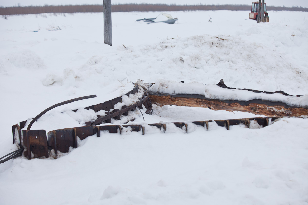 Основное оружие чистильщиков зимника - "гитара". Гусеница от трактора с бревном в форме треугольника.