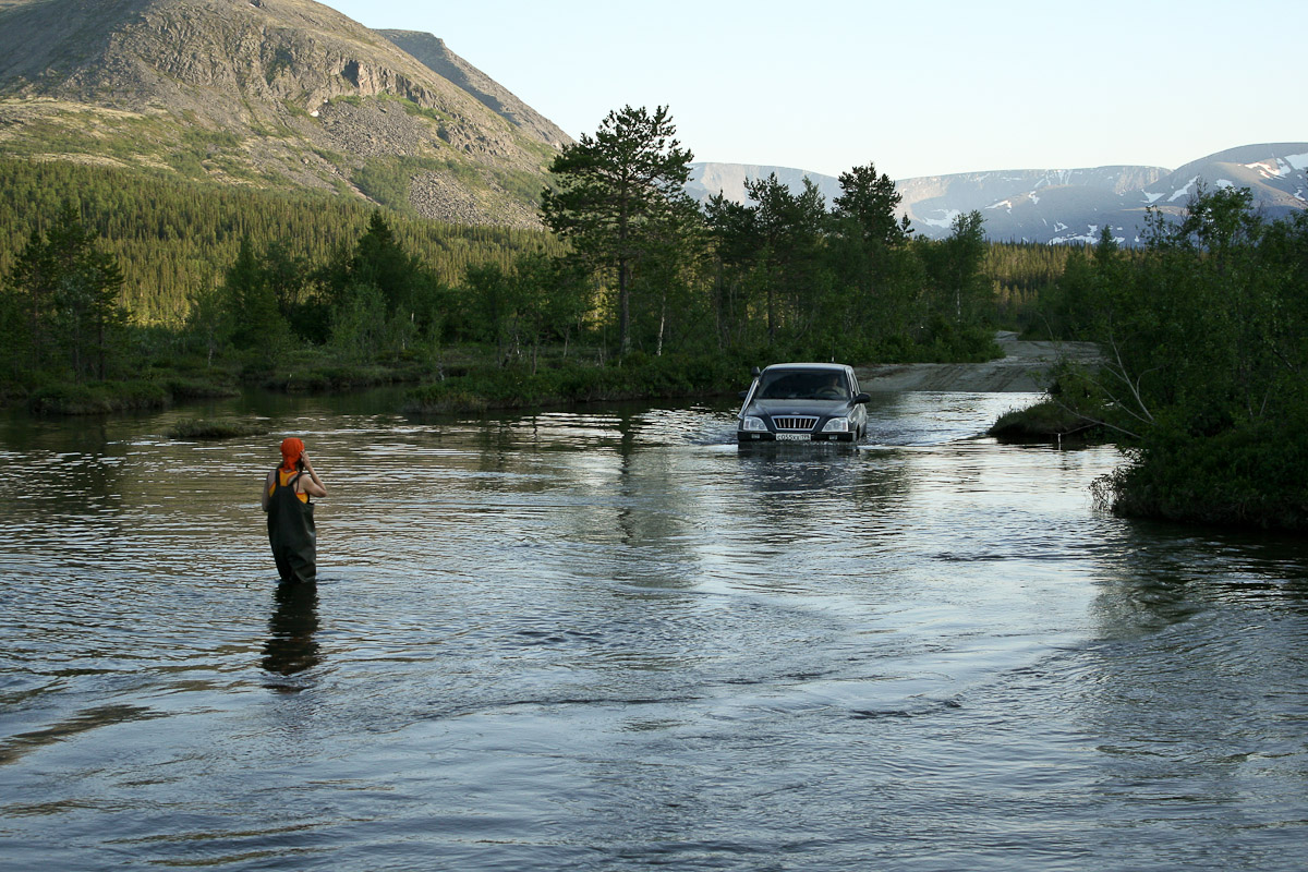 Нам пора дальше. Решаем попробовать пройти брод через Бассейная Куна. Никто достоверно не знает какая там глубина, а весна в Хибинах поздняя и воды много.
