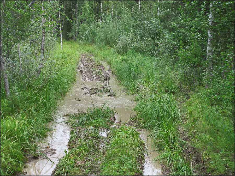 После этого дорога окончательно портится. Видно, что по этому участку дороги ездят гораздо чаще, причем отнюдь не на УАЗах. В сущности, дорога здесь представляет собой глубокую тракторную колею в очень глинистом грунте. На подъемах и спусках это глубокие промоины с торчащими камнями. В низинах все заполнено грязной жижей. Если в каком-то месте воды побольше, значит повезло – протектор более-менее нормально очищается. Если же глина в колеях по субстанции напоминает густую сметану, по ней с трудом едет даже Свампер. Местами он не едет вообще. Иной раз приходится пользоваться лебедкой даже при том, что машина не сидела на мостах. При этом местность имеет весьма заметный рельеф. Благодаря чудовищным колеям-промоинам на крутых подъемах то одно, то другое колесо висит в воздухе. Несколько раз удерживаем машину от опрокидывания, прижимая колеса к земле лебедкой. Крены такие, что вылезать и садиться в машину Андрею систематически приходится через окно.