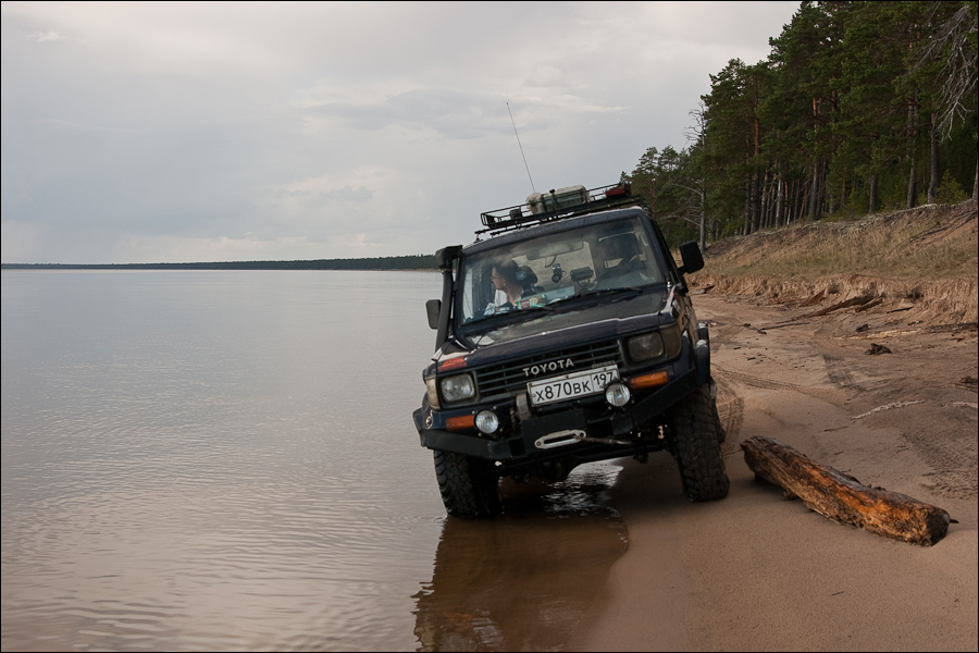 42. Утром собрались в обратный путь. Я завел мотор Хавчика, он бодро запустился и через 30 секунд заглох. Пытаюсь завести снова - мотор неестественно легко крутится. Открываю капот, топливо в фильтре есть. Пробуем еще несколько раз - тоже самое, даже не схватывает и вращается легко. Что могло случится, чтобы движок так легко вращался? Кроме обрыва ремня ГРМ и открытых клапанов идей нет. Ищу запасной ремень ГРМ - не взял. Решаем тащить Хавчик на тросе - других вариантов нет. На лебедке выезжаем с берега на пляж, по нему до выезда на болото. На засадном месте встречаем еще одну Тойоту.