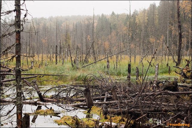 Решил попробовать пройти ее по целине, но тут же ушел по колеса в болото.