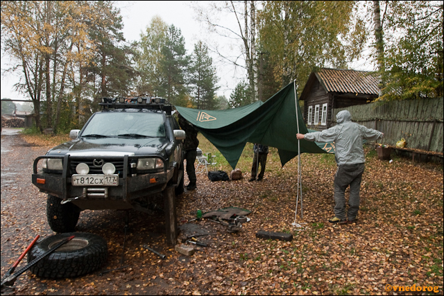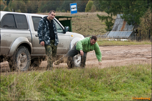 До Алеховщины не доехали 10 км. Андрюха поехал вперед, одолжил ключ на какой то рембазе дорожников. Они же подсказали телефон некого Василия, у которого есть пресс. С жутким хрустом на 20 км в час мы медленно поползли 10 км до Алеховщины.