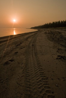 Едем дальше по песчаному пляжу. Настоящий курорт – море, солнце, жарища, белый песок и что особенно приятно, ни души. Отъехав пару километров от Лямцы втсаем прямо на берегу.