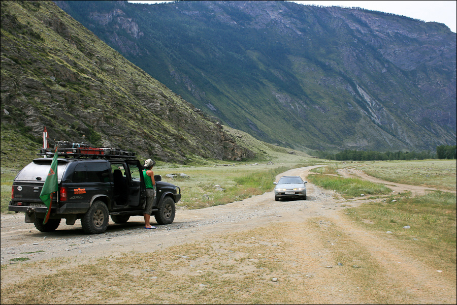 Подъехали к перевалу, пофоткали долину Чулышмана со скалы. Потрясающие виды гор, на некоторых лежит снег, на противоположном склоне водопада. Разговорились с одним из туристов. С его слов, до Телецкого порядка 80 км такой же дороге, есть один весьма глубокий брод, но легковушки проходят. В Балыкче очень негативно агрессивно настроенное местное население и лучше туда не заезжать. Есть место от куда виден каменный гриб в бинокль. До водопада порядка 10 км пешком по города, тяжелый подъем. На самом Телецком особо смотреть нечего. В общем мы решили не тратить время и силы, прокатится по перевалу и возвращаться.