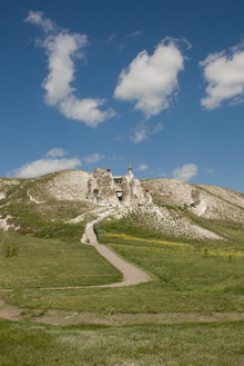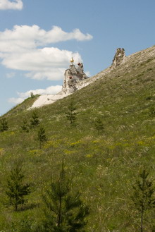 Следующая цель – Белогорье. По всем отчетам мы предполагаем что заезд должен быть «легковой» Но дорога идет по какаим то задворкам деревни, местные , смотря на Маздая , говорят «ну на этом то вы там наверное проедете». И действительно...колеи от трактора, правда подсушенные, мы преодолели без проблем. Часам к пяти вечера добрались до храмового комплекса в Белогорье. Как заезжать сюда «по асфальту» я так и не понял. Перед домом прямо в поле, (трава по колено) висят таблички "паркинг", далее шлагбаум. Оставляем авто, идем на территорию. Куча толи мух толи мошки вьется в окрестностях. На территории...тишина, никого, куда идти (и можно ли идти?) не понятно. Наконец некто вышел на стук, сказал что идите по дорожке. Срускаемся по тропе на склон, по краю сделаны перила. В склонах входы в храмовые пещеры, все закрыты, кроме одного. Вхожу. На входе сидит священнослужитель, считает бабло.