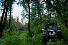 Вечереет, пора вставать на стоянку. Трек в какой то момент почему то уходит в сторону от Дона, мы же решаем попробовать уйти к реке и встать на берегу. Сначала хорошо различимая колея завела нас в лес. Лес – это мало сказано, более правильно называть это сельвой. Влага и теплый климат способствуют сочному росту всевозможнейших растений..чуть ли не лианники висят. Едем вперед: слева пруд,плавно переходящий в болота, срправа, за деревьями , отвесные моловые скалы.