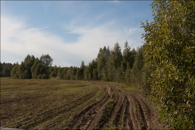20. Поля вспаханы, почва набухшая. Находим какие-то тракторные колеи и едем по ним. Часто приходится объезжать мокрые низины - сесть в чистом поле не хочется.