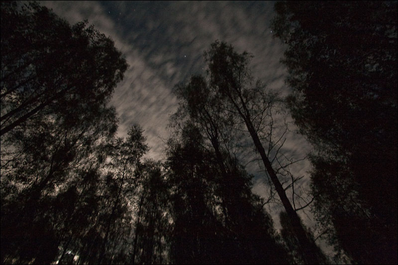 35. Кругом полно следов кабанов. Птиц не слышно - глухая тишина. Любой треск в лесу воспринимается с настороженностью. Благо, были дрова - костер горел. Наконец-то удалось снять вращение звезд. Угадал с точкой, угадал с настройками, даже линза не запотела - вот результат.