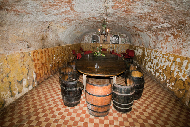 Для нас двоих за 20 гривен с носа провели небольшую экскурсию (правда, без дегустации, но мы все равно за рулем). В подвалах прохладно и полумрак – вино любит такие условия. Подвалы очень старые, раньше это был замок Тамплиеров, узники и прочая мифология.
